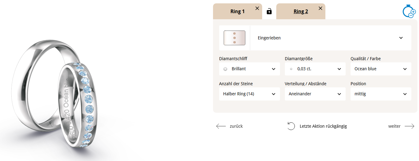 Über den Fischer Trauring-Konfigurator lassen sich diese Farbdiamanten im Schritt Diamanten ganz einfach auswählen, kombinieren und direkt visualisieren. So entsteht ein Trauring, der perfekt zum persönlichen Stil passt und die Einzigartigkeit Ihrer Liebe widerspiegelt. Fischer Trauringe mit Farbdiamanten sind damit nicht nur Schmuckstücke, sondern echte Statements – individuell, hochwertig und zeitlos schön.