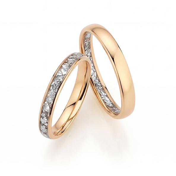 Wedding ring set from the Fischer Flakes collection. The aura is what surrounds us all, something intangible yet so powerful. Our "Golden Aura" model embodies precisely this certain something: simple and exciting at the same time. The flakes create a breathtaking interplay of light and shadow, harmoniously rounded off by the warm tones of apricot gold.
