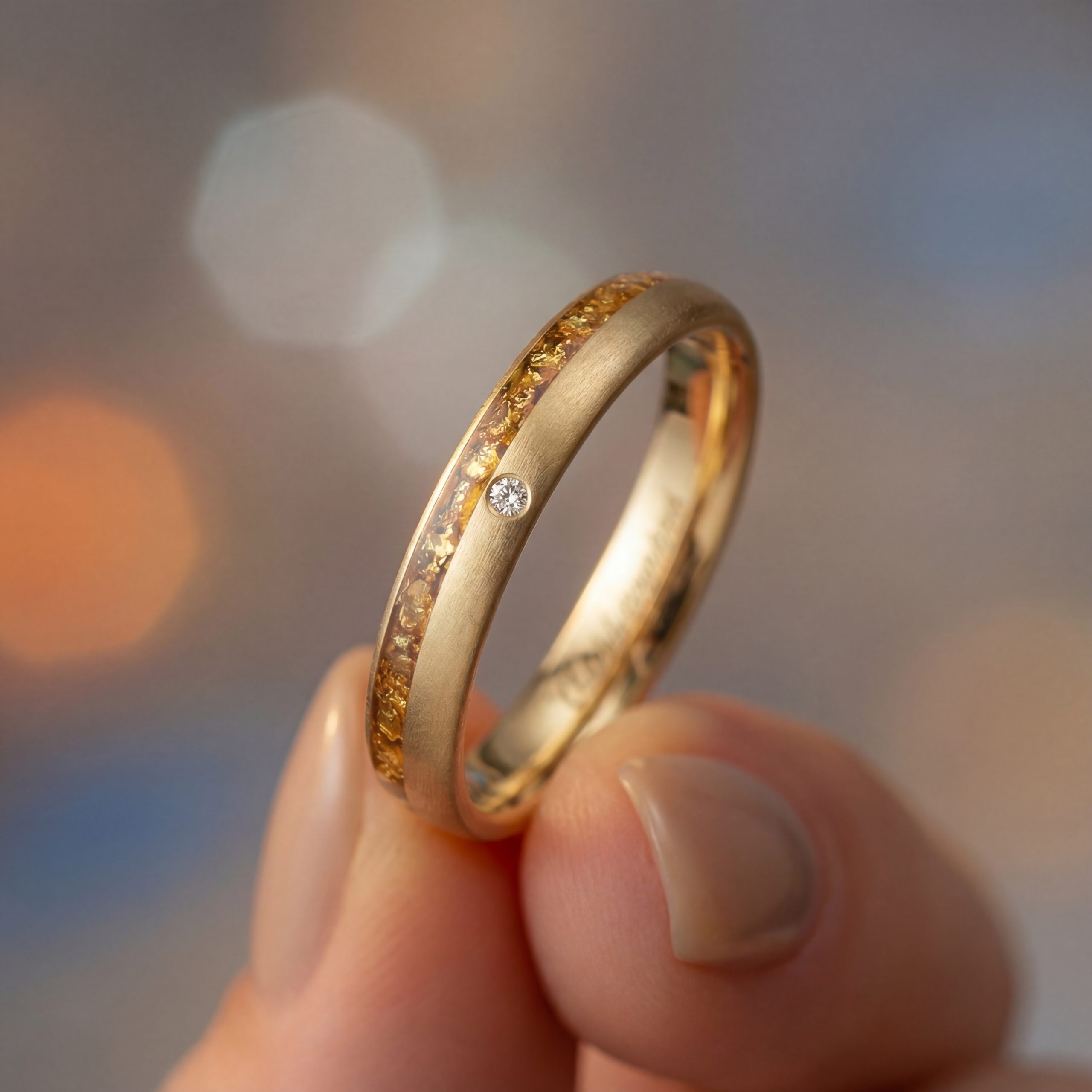 In Kombination mit der Reibmatten Oberflächenstruktur kommen die Goldflakes besonders gut zur Geltung und werden beim Damenring durch einen Brillanten harmonisch abgerundet.