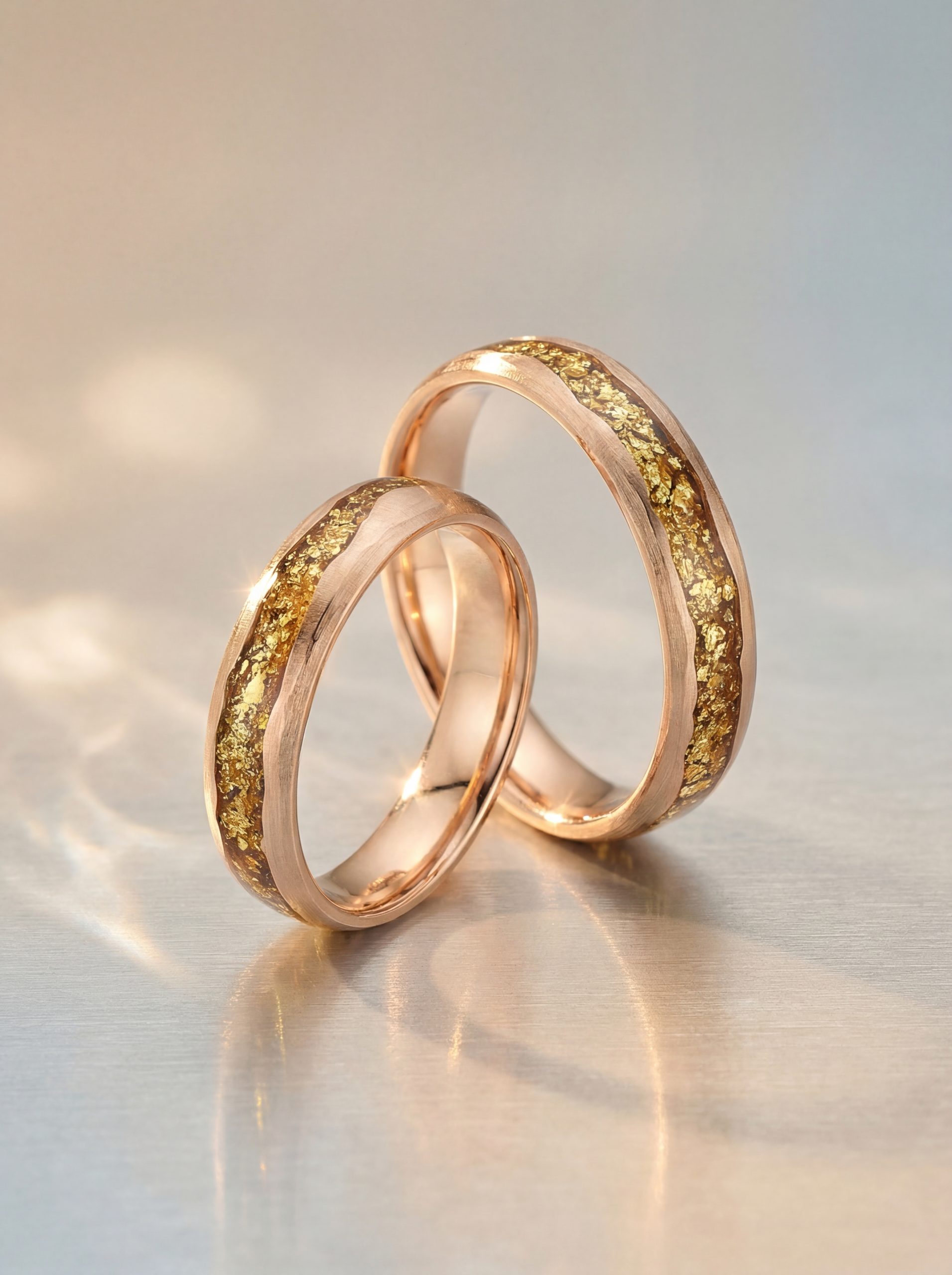 Trauringpaar aus der Kollektion Fischer Gold Flakes. Wie geschmolzenes Metall zieht sich der Fluss aus Goldflakes anmutig durch das Rotgold. Die Oberflächenstruktur “Rinde” verleiht dem Design eine von der Natur inspirierte Note und lässt die Ringe noch lebendiger wirken. Das Zusammenspiel erinnert an zwei geschmolzene Herzen, die in den Ringen zusammenkommen und sich auf ewig verbinden.
