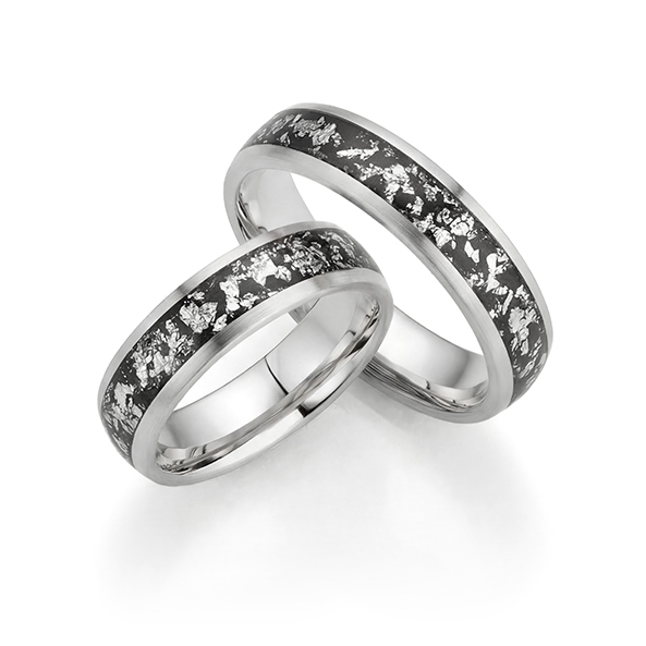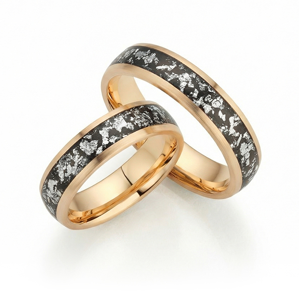 Wer liebt nicht den Sternenhimmel? Genau dieser findet sich in unserem Modell „Midnight Glow“ wieder. Die einzelnen Flakes erstrahlen vor dem dunklen Carbon wie eine neue Galaxie, in der man am liebsten versinken möchte. Gesäumt werden die Ringe von warmem, feinmattem Apricotgold. So harmonieren das mystisch wirkende Carbon und die funkelnden Flakes wie kleine Sterne, die sich sanft um die Finger legen.